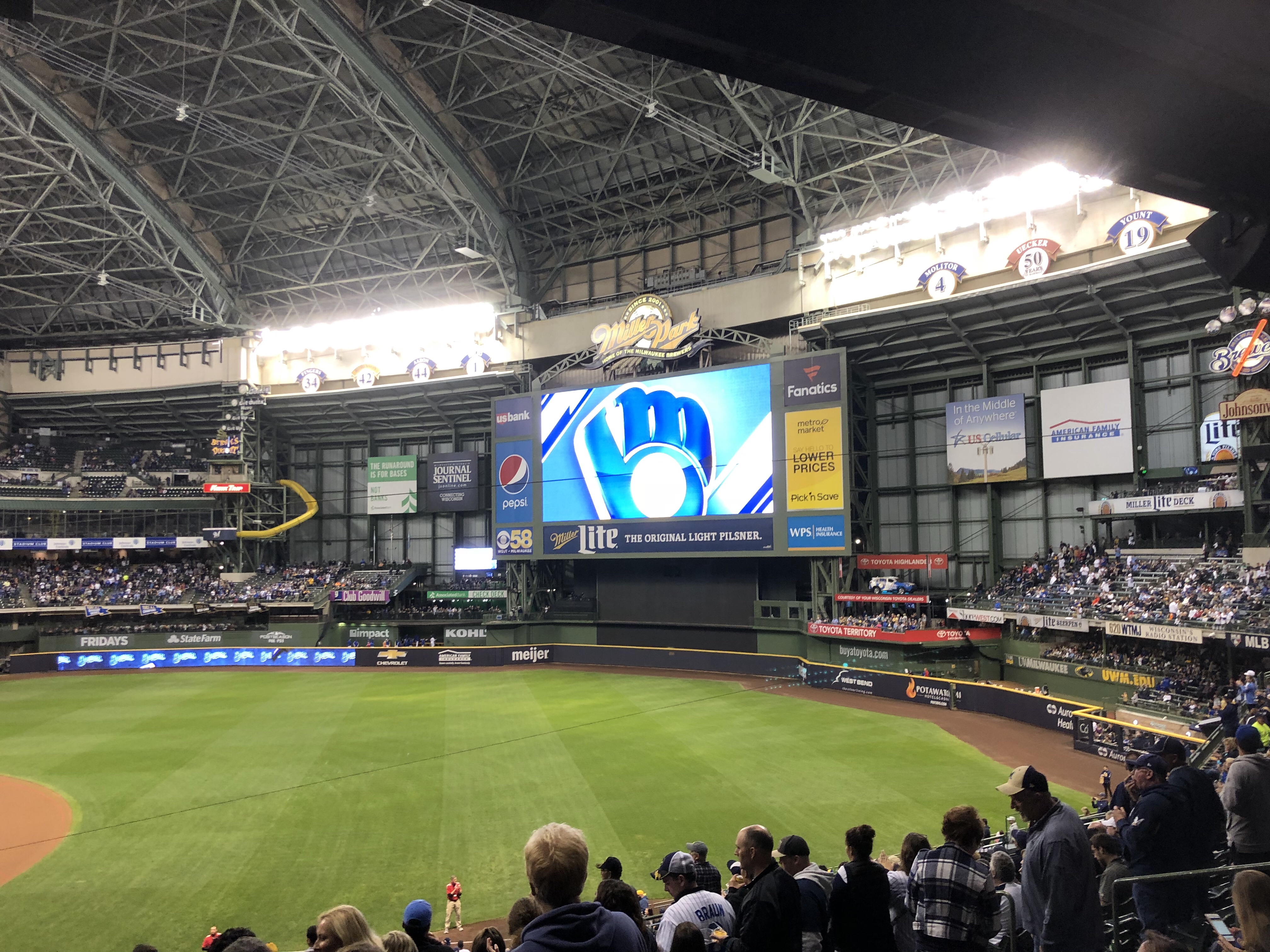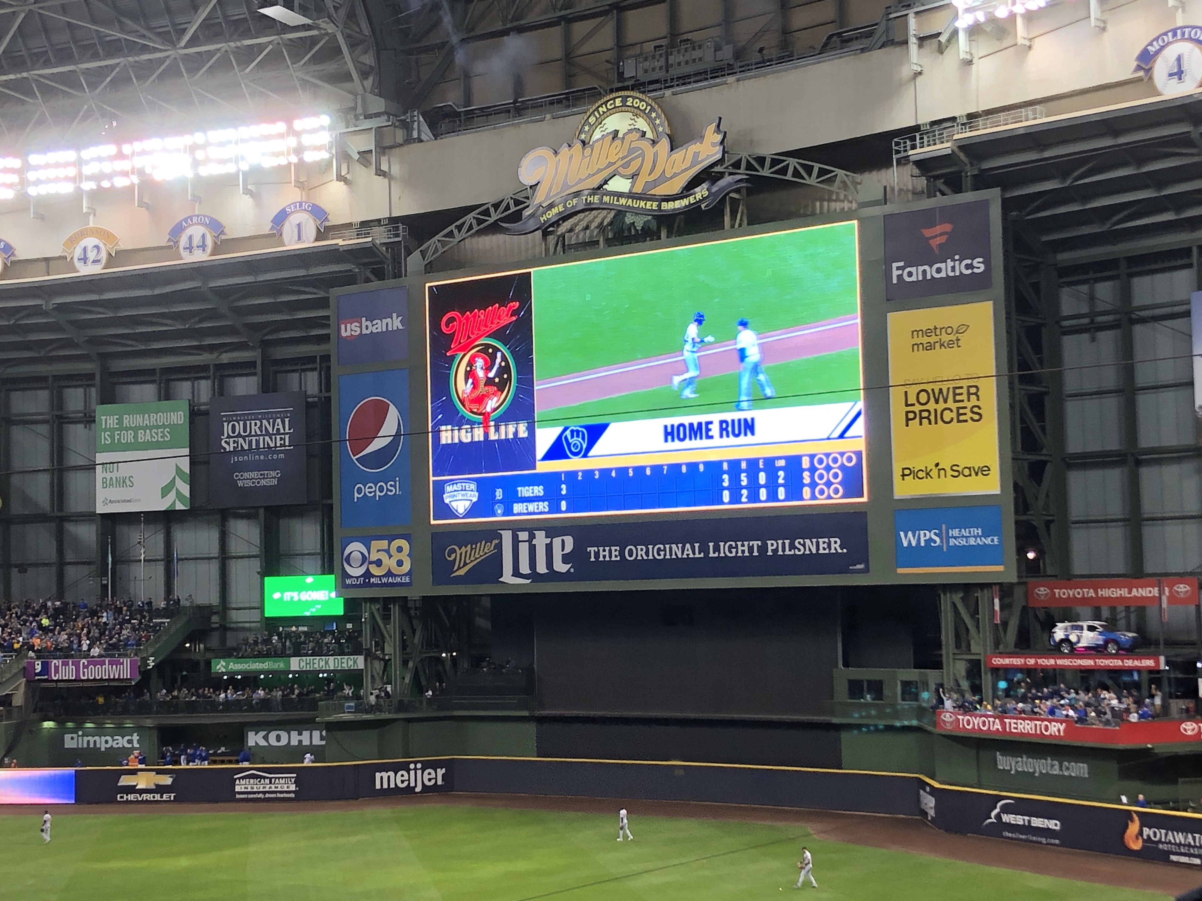 Today was wake up and go to work. Started working on a new project that has to be done before the end of the year and is a logistics nightmare. We are essentially going form ND to TX and hitting 32 locations in-between. I came in early so i could leave around 4:00 to get the kids. I haven’t told them yet but I scored Brewer tickets for tonight’s game against the Detroit Tigers. We get home from pick up and let them know. They of course go wild. We gather our game day items and were off. Traffic was pretty good on the way down until the exit. I would say 10 min delay. We park and go in and. The boys stop at guest services and score some free baseball cards and we head over the kids activity area. They do a sausage race, James runs the base timer, Sam goes down Bernies kid slide, and they both do the radar pitches. Afterwards we find our seats and have hotdogs, cheese fries, and a Pepsi. I have a Coors light. The game was awesome! A lot of excitement at the park. 3 home runs tonight. I get the kids some custard and have another Coors. On the way home both of them fall asleep. We are home by 11:00. I put them down and have another beer while I wind down from the drive home. No workout today but did quite a lot of walking at the stadium.