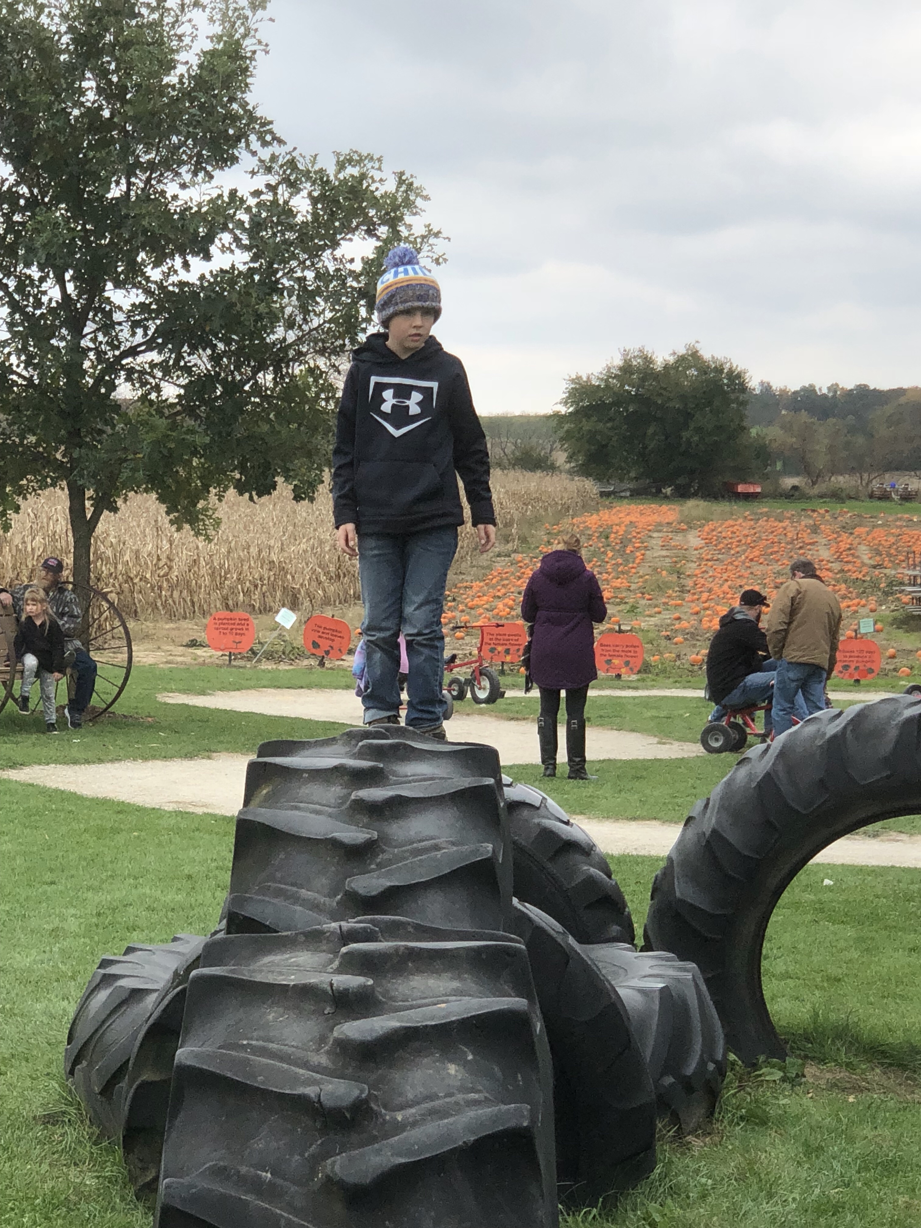 Sunday we went to the pumpkin patch. It was a good time. Ran all over the farm and explored. Managed to get stung by a yellow jacket in my palm when were feeding the goats. That sucked big time. Hand swelled up pretty good and itched. We did the corn maze and that was actually about a 30 minute adventure as we checked out the dead ends and meandered our way through. The kids had a blast and it was good to get out for the day. Got home and took 2 Benadryl for the bee sting. It messed me up pretty good. Tried to sleep a little while I watched a movie with Sam. I was irrational and irritable from the medicine. Ate some meatloaf dinner and had to sleep.