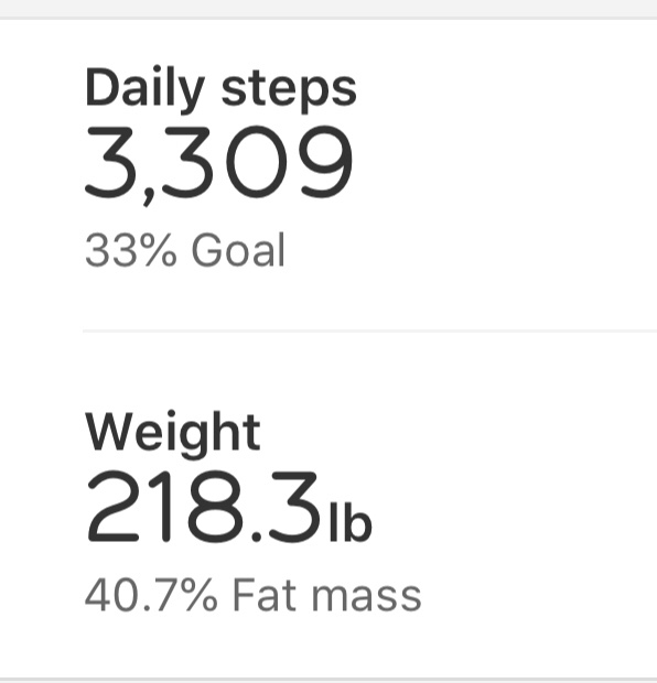 10-29-18: Well I happened to fall off the wagon for the last two weeks. No workouts and no hard core dieting. Weighed myself and I’ll be, holding at 218 lbs. I’m down from my last weigh in on 10-16-18. Picture of the scale came out like crap. But I have the Withings smart scale and booyah, saved to my phone. Not impressed with my steps though. Treadmill does not count towards steps. Might have to be next on my list of tech.