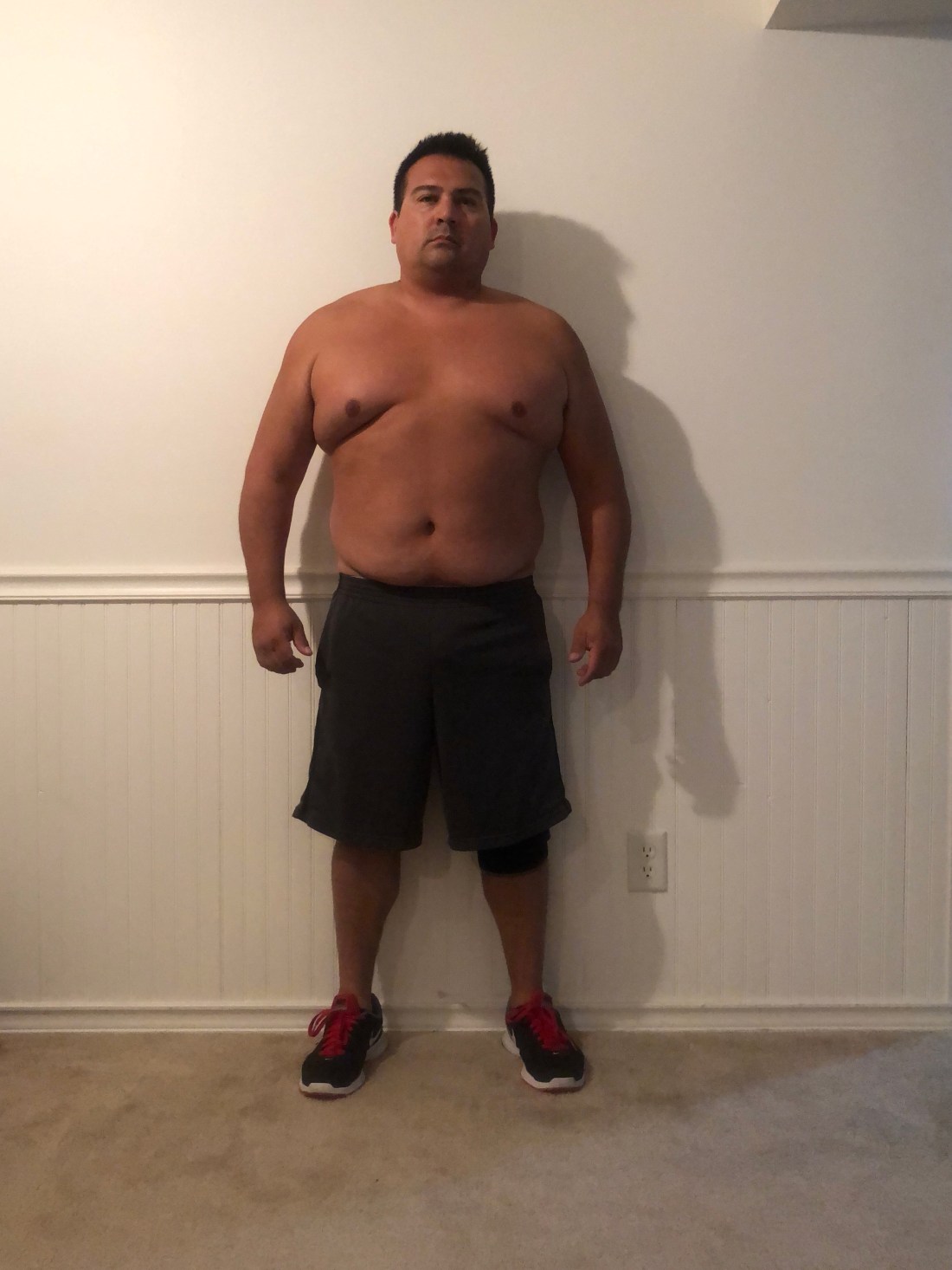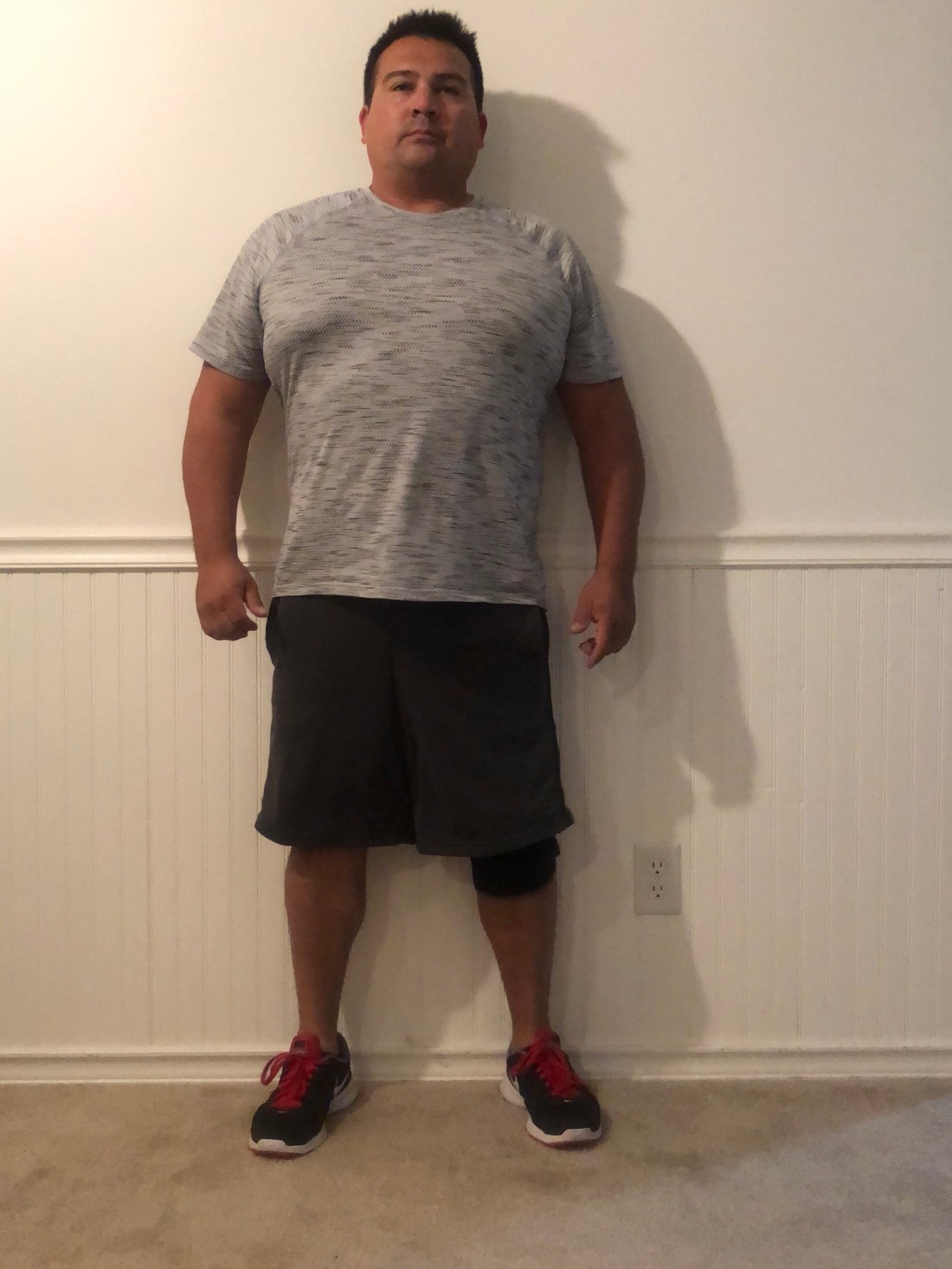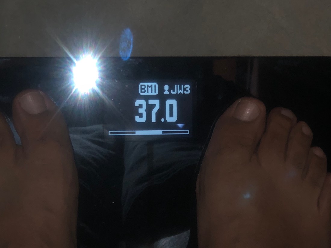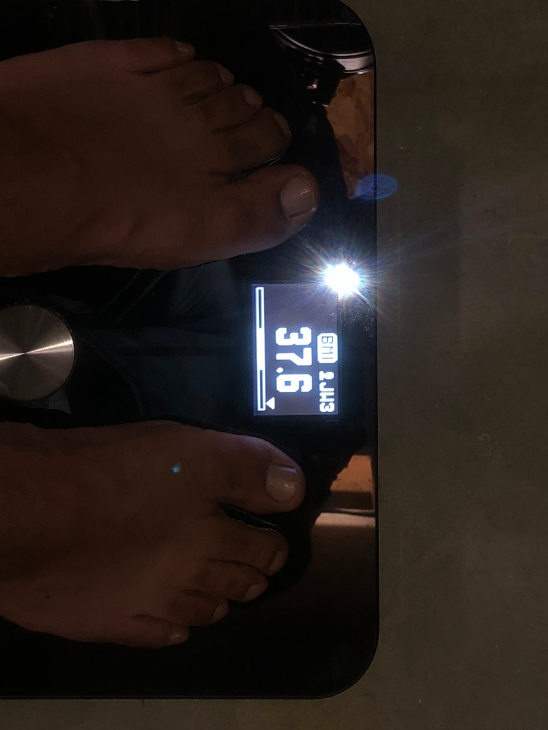 Now it is time for stats. First I set up my phone to take a couple of pictures for reference of my body changes over the next four months. Next is the weigh in on our WiFi scale. This takes both body weight and BMI measurements. I understand that the BMI can shift a little based on hydration but it is not going to matter in my case.
